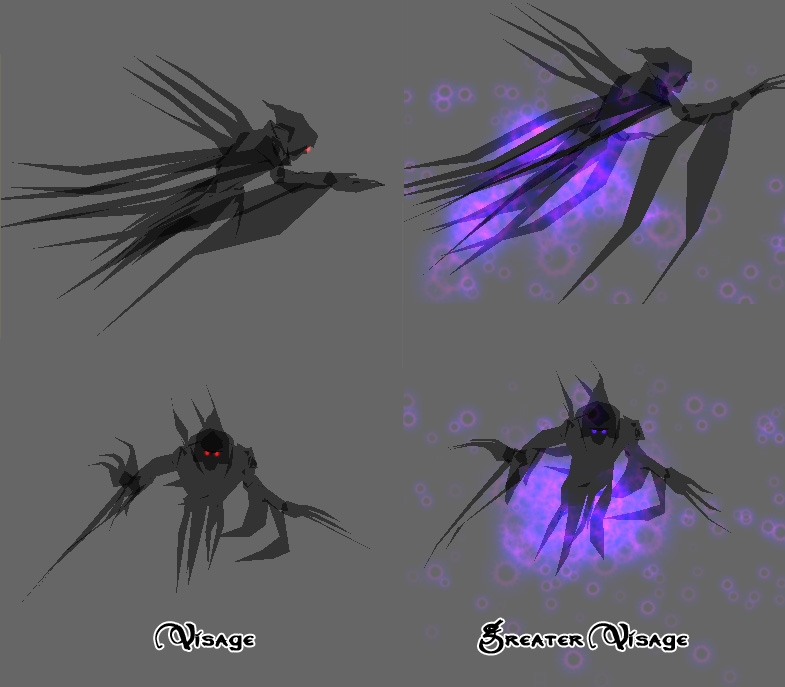 Here are two variants on a new undead crtitter. I was originally just going for an alternate model for the wraith, but decided to just give them their own identity. They are obviously based on the spectre/wraith model, and the main differences are that they have a much looser danglymesh so they appear a bit more ethereal, different colored eyes, different texture, and the model modifications like longer claws and longer trailing things, and of course the emitters on the greater visage.