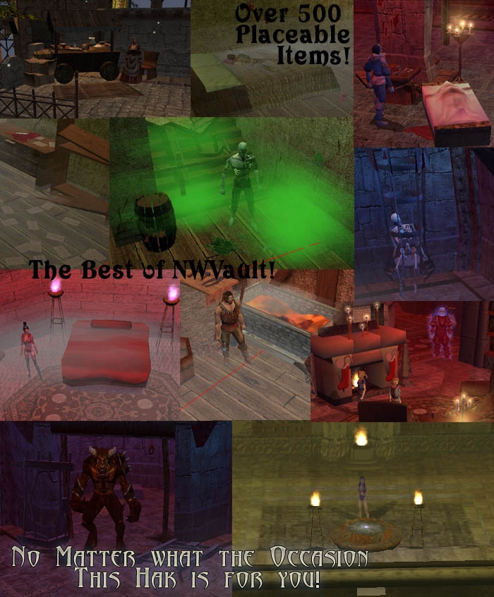 Included haks: MGS's All Purpose, Firebowls & Fountains, Egypt, BRolanda's Beds v2.1, Killer Axe's Bookcases, Danmar's LOK Bar, Janus's Chairs, NewAge's Columns & Things, Zonker's DeathMachine, Brother Roth's Debris, DOA Shop Frontage & Signs (xpack included), Ice-Child's Fencing, Tables&Stool, Outhouse, & Wine Casque, Dobervich's Fireflies, Voilition's Complete, Lief's Fog 0.1, Adam Miller's Flowers & Water, Eden's Forge, Elderon's Temple Statues, JeffBarrow's Pine Trees, Janus's Chairs, Kerry Mortensen's Misc, NekidFrog's Water, Nethy's Upgrade Xmas, Peter Poe's Patches, Saloran's Food, NWC Snake's Loom, Schazzwozzer Placeable Pak, Digitalknightmare's Liquor Cabinet, Lucifer Church's Shed, Rimmy's Tracks, Lisa's Mirros, Canopics, & Crystal Balls, Martin E's Tir Na Og - Tree Pack 1 v2.01, Spoonmerlin's Boats, Lisa's Babylon, Sarcophagus, Anachrodragon's Drow Signs, Danmar's LoK Pak. NEW: Tir Na nOg 'Dead Tree' hak (full), and 2 new benches from Janus' Sittable Chairs