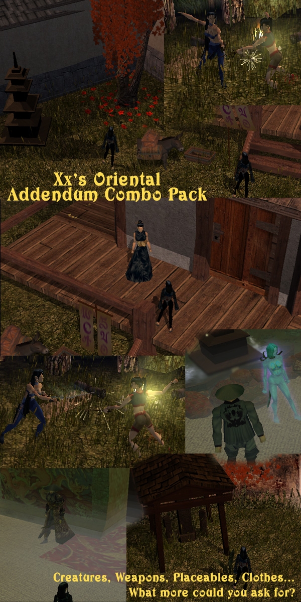 | So I was playing around with the Beta version of Coulisfu's Oriental Add-On to the Rural Tileset and I thought to myself, 'Self... what this needs is STUFF!' (You can find that Work In Progress here: http://nwvault.ign.com/Files/hakpacks/data/1057961094372.shtml ) So I collected all of the relevant haks that I could find, and set out to combine them in one! Haks (full and/or partial) included: BearThing's Heads, Lisa's Clotheshorse (Selective), Robert Burson's Sedos Clothing & Necro Pack2 (Selective), Evolbah's China Dress, Stumpofgob's Armor, Thallion's Stellani's Leg Pack, Adam Miller's Water, Dobervich's Fireflies, Ice Child's Outhouse, Janus's Chairs, Mortensen's Shrines, Lisa's Dragon Rugs & Tapestries, Leif's Fog, Martin E's Tir Na Nog Trees - Live & Dead, Nekid Frog's Waterfall, Veldin's Futons, Zarathustra's Flags, Eligio's Oriental Weapons, Arcana Blackmoon's DLA Horses, Bloodmonkey's Pack Animals, DoA's Working Oxen, Hydromancerx's Bear Pack, Nitocris Finniksa's Swine Pack Please read the html ReadMe file if you have any questions, I tried to make it cover everything I could think of. To unzip this file, you need WinRar, or a similar program. (WinZip Will *not* work!!!) If I missed anything, let me know. Hard for me to test it all. =) |