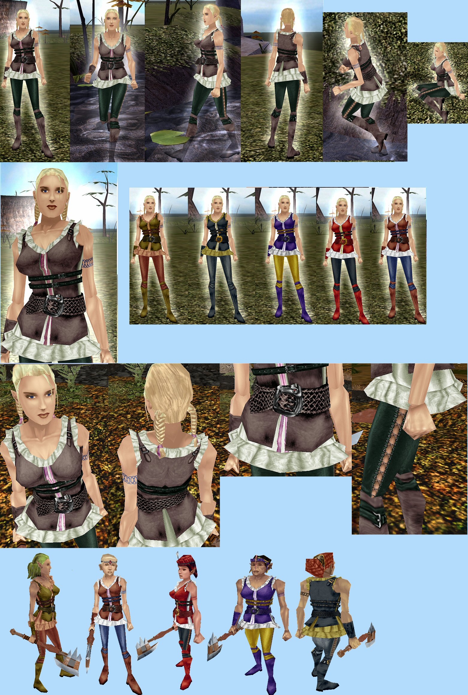 Like many others, I love Kim's portrait of Freya I decided to make the outfit playable in NWN :) I did it strictly for my own fun & challenge but thought other fans of her portrait might enjoy using the outfit too. I hope she doesn't mind - I never heard back from her when I emailed her... _________________ I tried to stay in keeping with her portrait as much as possible but had to make some adaptations for NWN style armor parts. I made the boots up myself, as they aren't visible in the portrait. The dragon buckle I copied as closely as possible from the portrait. The head is merely Bioware head 25 with braided pigtails added. _______________ Outfit is for thin females only; head is human only. This outfit took a very long time to make and I have no plans to adapt it for males, or fat women.