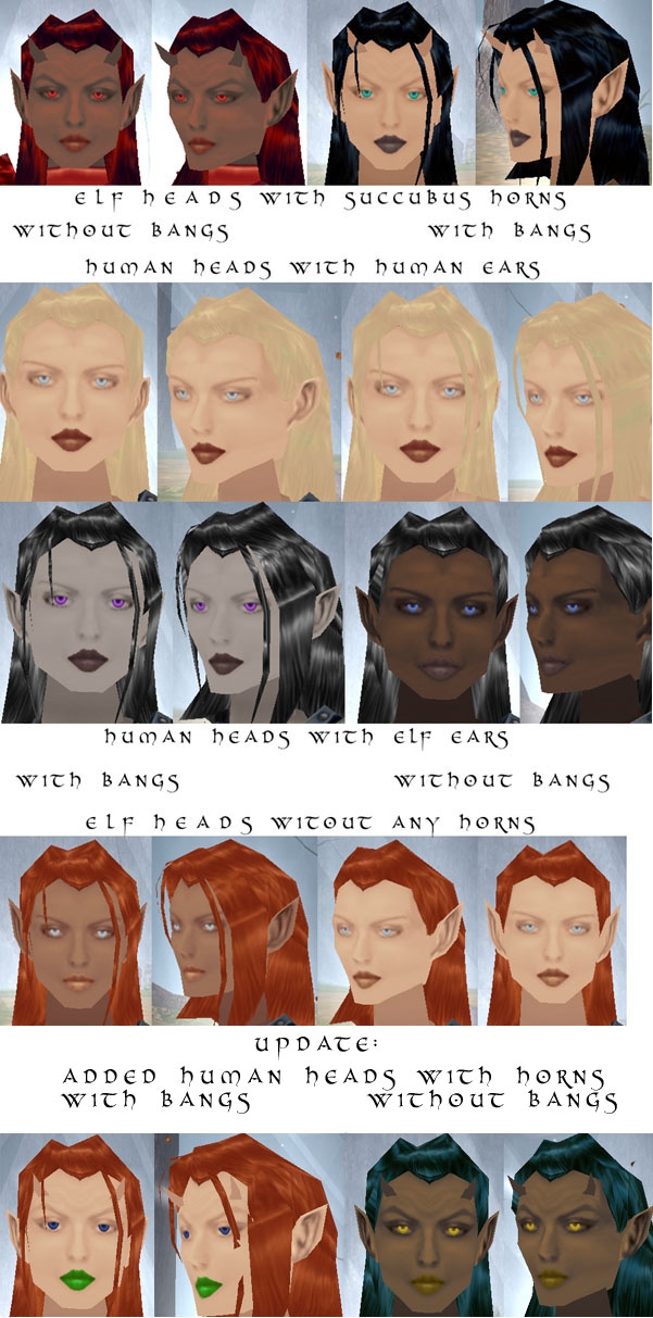 This is a group of heads I remodeled using my Jana Cova head. There are 8 models, 4 for the elf and 4 for the human. The different heads are described in the ReadMe file. These are all non replacing heads. 2 of the elf heads have succubus horns so we now have a little more variety of female heads with horns. They could also be used for tiefling variants. Some of the head models, as numbered, may not show up at character creation, so they will have to be added to player characters using Leto. The horns on the two elf heads reflect the skin color in a darker shade. I also uploaded a portrait based on one of the succubus head models in this pack which should be in the portraits section about the same time this shows up. Enjoy :)