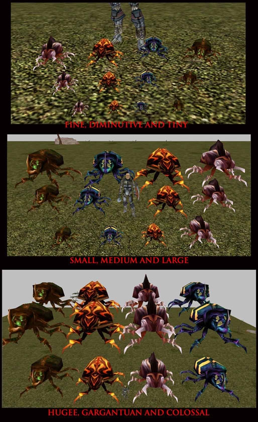 Simple but effective. Those gargantuan and colossal ones are perhaps a little *too* big for NWN though - I'd need to rebuild my areas to make room for one of those monsters! ;) There were also some clipping problems with the huge ones, where their legs would sometimes go through bits of tiles. I'm not sure how easy that would be to fix. Either way, I'm only using the small and large beetles in my module, so it's not causing any problems for me.