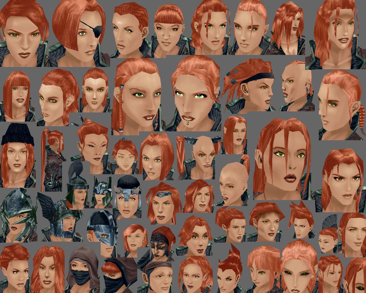 This is the second volume of the Headhunter Trophy Case, its all the female human heads you could ever want (skinny phenotype, no fatties). It's a hak so you got to know what you are doing a little bit (quit unzipping everything in your override directory and open the toolset for once hehe), but since its only heads you'd have to be doing something pretty freaky to mess something up with them. Eyes are tattoo color 2, lips are tattoo color 1, and they should all have eyebrows that match their hair color, too. I messed with some of these but of course I didn't do hardly anything compared to all the amazing vigilante artists that came before me, let's not take 'em all for granted. I think we owe really owe thanks to the guys at bioware more than anything (whoever they were, after looking at all this stuff in detail I wish I knew, they're awesome), 'cause they're the ones who really made most of this stuff this junk is made out of heh.