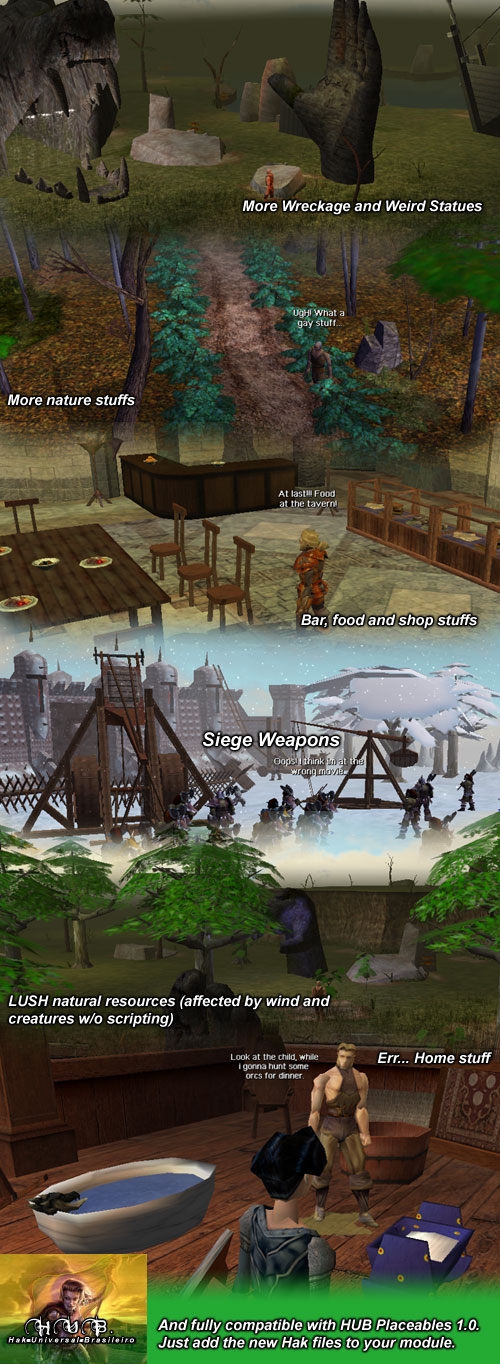 This is the 2.1.0.1 version. It includes everything that HUB 1 doesnt have and the the community is asking for like: statues, foods, glasses, siege weapons, sfx�s, etc. The haks list is in the readme.txt. This zip includes HUB Placeables 1 and 2. Our forum is at NWNBrasil.com.br. Theres english support there. Join us with suggestion and opinions.*************************** Esta � a vers�o 2.1.0.1 Ele possui tudo que o HUB 1 n�o tem e que a comunidade internacional tem de melhor: est�tuas, comidas, vitrine, armas de siege, mais de 20 sfx, etc. A lista de haks utilizados segue no leiame.txt. Este zip possui o HUB Placeables 1 e 2 juntos. Criamos este hak baseado nos pedidos do NWNBrasil.com.br. Participe do forum e contribua com mais sugest�es e criticas.