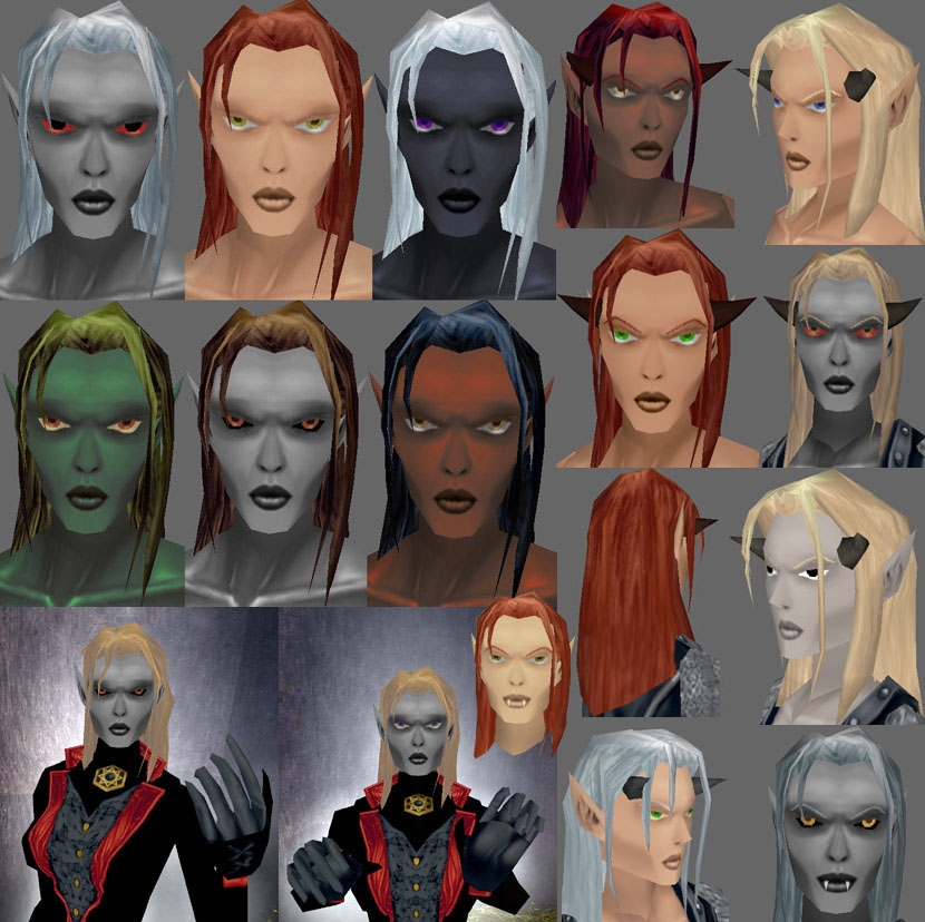 I wanted a decent looking evil elf head, and came up with this. It works great for an evil or undead female elf. There are 4 heads, 2 elf (one with eyebrows, one without), 2 tiefling (varied horn positions). The eyes use both tattoo 1 and 2, and the horns are a mix of skin and hair. The horns do not look the same in the toolset as they do in game. Enjoy :) UPDATE: Added a pic of the other tiefling head in the large preview and added a vampire head model.