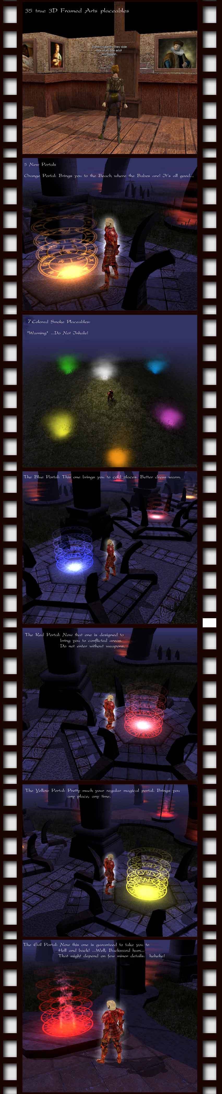Content: - 2DA modifications, 5 New Portals, 7 New Colored Smoke Puffs, 35 Fully Framed Arts, 1 Ceremonial Altar,4 Huge Columns(previously From 'City Column Hak'), 1 Upright BIOWare Sarcofagus. Needed TGA's/DDS. All placeables mostly use NWN Original Textures. Oh yeah, a module is included for you to check them out. Enjoy! ;0)