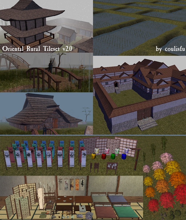 This hak adds new features terrains and groups of an oriental theme to the Rural tileset. Included are 8 new terrains, 3 groups, 23 features and 107 new placables. I've also included Hills by Thallion Stelliani (thanks thall). Please read the readme included and report any bugs or suggetions you might have. I'd also like to say a big thanks to the NWN community for all the advice and feedback they have given me while working on this little project. Have fun.