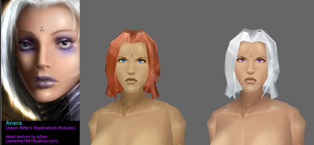 This is a face replacement texture for Anera from Adam Miller's excellent Dreamcatcher campaigns. I felt the default face chosen for her was too pale and perhaps a little on the ugly side for a 16 CHA celestial :) Working based on the Anera potrait (as it is throughout the whole campaign) I experimented with her face with the goal of making both of them as similar as possible. It is almost impossible to include good looking separate makeup and lipstick color in a PLT texture so I decided against including them. This is the end result. The head model (unaltered) is also included if you choose to add this head to PC selectable heads. Install instruction to replace the Bioware Head is in readme. Eye color is Tattoo1.