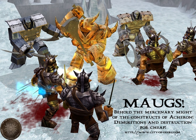 Have you ever wanted an army of constructs all your own, but found your skills not up to the task of creating a horde of golems? Well, don't despair! From the planes of Acheron to the front door of your fortress and/or dungeon, the mercenary Maugs will serve anyone with the jink to pay them, and they don't bother talking back or asking 'Why do we need to burn this town to the ground?'