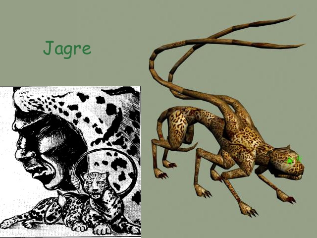 | A re-skin of DM_Shade's Displacer Beast. These monstrosities were spawned by Zaltec on the Night of Wailing, though they did not make their appearance until later. While normal warriors became orcs, and jaguar knights were transformed into ogres, certain high level jaguar knights became especially large ogres, which were later changed into jagres. A jagre is a huge, brutish humanoid with cruel features. All jagres bear the mark of the Viperhand, a red brand in the center of their chests. They wear armor made from displacer beasts, which allows them to transform themselves into displacer beasts. The latter form has the tentacles and six legs common to displacer beasts, but its coat is usually a reddish brown with dark spots, like a jaguar's. |