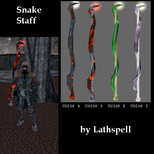 Title From the Outlands: Snake Staff Author Lathspell Submitted / Updated 01-09-2005 / 01-09-2005 Category Weapons Expansions Works on all versions Description From the Outlands: Snake Staff Created by Lathspell, Ideas from Quaestor Another bit of content from Quaestor's Outlands NWN Campaign. A magic staff for all the snake lovers out there. Files