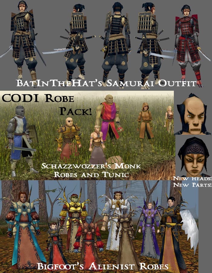 You worship a foul goddess of spiders? Want to look appropriate for that foul denizen of the nether realms you're summoning for dinner? Are you a proud and noble samurai? Are you a monk that just can't seem to get the right 'look'? How about a crusader who thinks armor alone won't look proper to the heathens? Then the CODI Robe Pack I is for you! Works with the in-game conversation based robe-changer. If you have any problems please post them on our modeling boards.