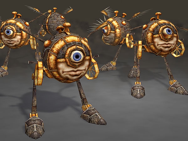 According to the 3E modron supplement, monodrones normally have two arms and two legs; only one of twelve have wings. There are a couple reasons I produced the winged type. For one, every single drawing or piece of art I've seen of these guys depicts the winged ones, I suspect because they look more distinct that way. More importantly though, giving him arms would have meant some substantial animation implications, requiring several new animations for each weapon type he could equip.