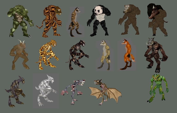 Although, I have some suggestion about the weretiger, the dark brown one (the second one in the middle). It does not look like tiger type, more likely to be a bear because of the skin color... If it is intended to be tiger, the skin should have lighter color, and either dark brown or light brown stripes.