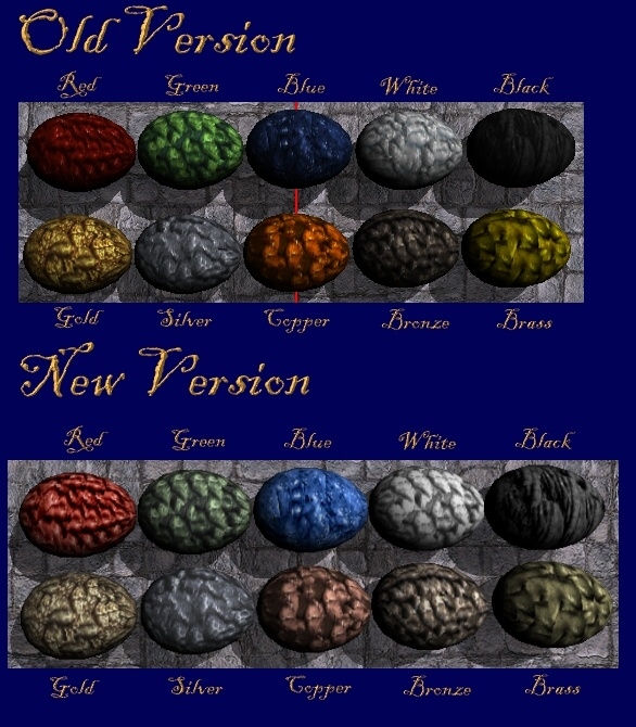Stone Monkey made this wonderful Hak with hatching dragon eggs. I did not have anything to do with the models or scripts. I just felt that the colors on the chromatic eggs were too intense and unnatural, and the metallic eggs did not really resemble the metals they represented. {I am kind of focused on metal colors, because I'm a jeweler. :-) Also, the white egg texture had a noticeable seam. So, I made a new white egg texture based on the green one, and adjusted the colors to be more 'realistic', if dragon eggs can ever be so. :-) Yes, the metallic ones are now a bit harder to tell apart until you get to where you recognize the patterns, but how many people do you know who can tell Brass from Bronze at a glance in a cave? I re-compressed the file at a higher level of quality- don't worry, everything's there, it just took a bit longer at my end, and saved you about two-thirds of the download time. :-)