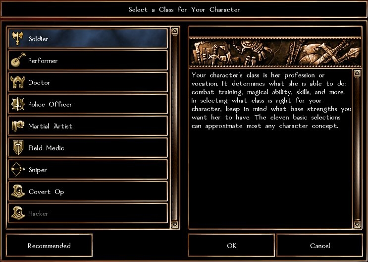 HOW TO USE: Put classes.2da in the override folder (NOT recommended) or add the hakpak to your module. Put dialog.tlk in the \NeverwinterNights\NWN folder, IT WON'T WORK if you put it in the tlk folder and select it from the Custom Content tab in the toolset. I haven't found a way around this on my own. real_dialog.tlk is the backup of the unmodified dialog tlk table. WARNING: You may have problems in multiplayer games if you use the override; the tlk file only has additional lines and SHOULD be safe. E-mail any problems to [email protected] Also I didn't add plural tlk references, sorry. WHAT THIS DOES: Changes class names and Hit Dice for changed classes to 15. Barbarian > Soldier Fighter > Police Officer Cleric > Doctor Paladin > Field Medic Bard > Performer Monk > Martial Artist Rogue > Covert Op / Hacker Ranger > Sniper Prestige Classes, Druid, Sorceror and Wizard disabled.