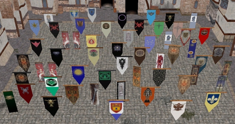 The triangular banners are danglymesh and were taken from the Bioware 'City Exterior' tileset (Cloaktower model). The square banners are standard trimesh and were taken from the JXP_Placeables collection here on the vault. Thanks Bioware and JXP for the great models!