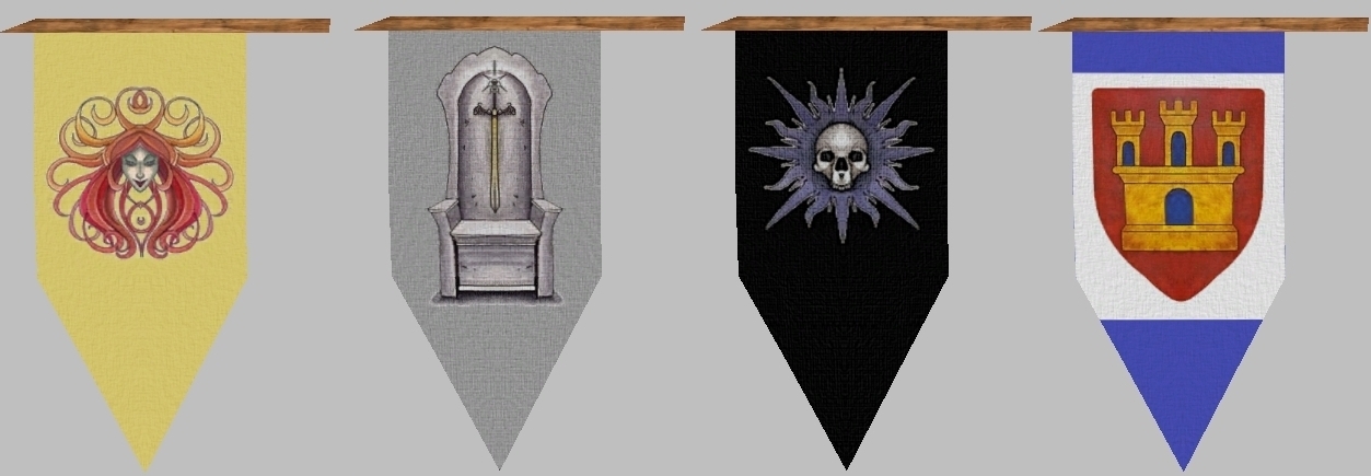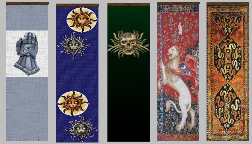 I modified the danglmesh models to be less 'springy' and have a bit more inertia similar to heavy tapestry. I added the support beam to the square banner model to give it some sort of attachment point to walls. The textures are from various places on the web - THANKS GOOGLE IMAGE SEARCH! :)