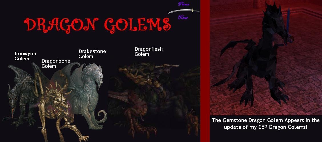 Title "Update" Dragon Golems CEP Author Princerouse Submitted / Updated 06-07-2005 / 06-07-2005 Category Creatures Expansions Requires All Expansions (SoU & HotU & CEP) Description Update to my original Dragon Golems, the golems are now compatiable with CEP, the hak pak has portraits of the Dragonflesh Golem, and I added a new golem that I made when i was playing D&D with my friends, the Gemstone Dragon Golem! Also Included in this folder is a demo of the dragon golems. Files