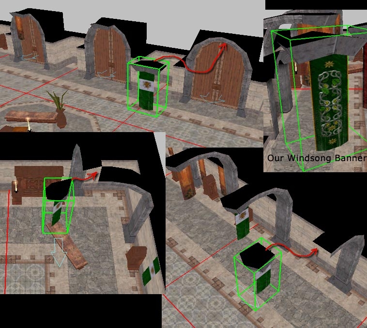 I have included our 4 Windsong banner placeables also. You can alter the banner tga as you like - replicate the 4 placeable mdls for as many banner tga's as you want, and have your own banners. The 4 placeables needed for each banner set are: 1-Arch over doorway 2-Sidewall Arch 3-Corner Arch 4-Wall Hanging. Feel free to use the Windsong banner set if you like :)