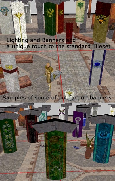 I then took those same nodes and turned them into placeables. Thus these placeables slide perfectly into the new tiles (or hang nicely on a blank wall). This has allowed me to create multiple sets of banner placeables only, without having to have a unique tileset for each different faction in our module.
