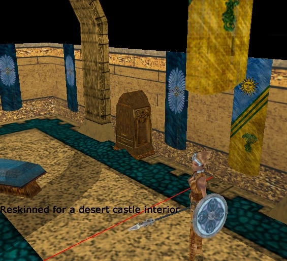 With a little re-skinning - these work nicely with other interior castle sets. I included a pic of our misalin castle interior set (a desert set we use for more then one faction) - showing a reskin of these placeables for a alternate interior set. These also would make a nice tattered banner set for that abandoned interior - just fuss with the banner .tga alpha channel a bit.