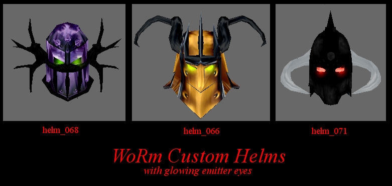 Just 3 new helms that I did awhile back,included is an updated Death Dealer Helm I did last year as well as 2 newer ones with more of a death knight theme (i like playing evil characters). All helms include glowing emitters for eyes much like the high level monks.