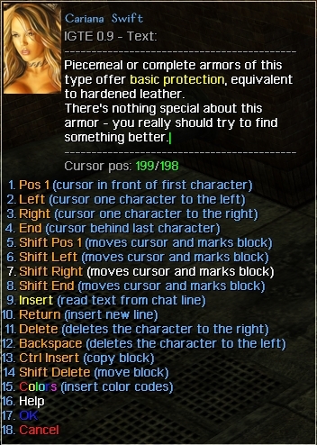 New in version 4.10: Added edit description (items / character), added rename item, added glowing eyes (supports custom races), change skin/hair/tattoo color.