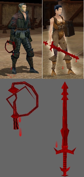 I pieced together these two weapons for a nasty PC character of mine (neither of the characters shown in the screenshot) who has a thing for blood...these all-red weapons constantly shed bloody drops which stay on the floor for a moment before soaking in and disappearing. Gruesome fun!