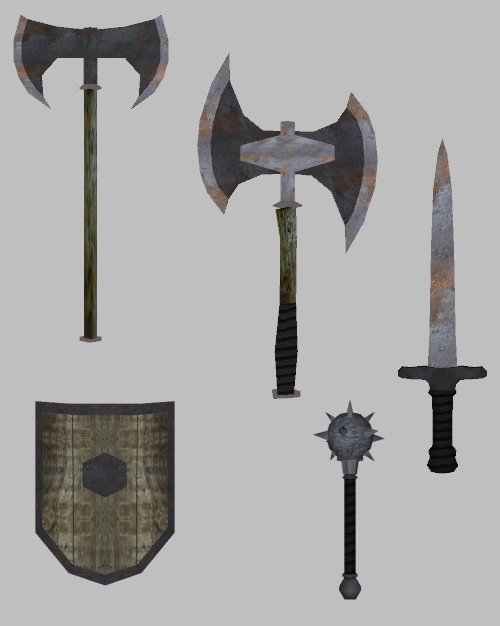 being wielded by the undead and add some immersion to the game. There are 3 large shields, 3 small/buckler shields, 3 greataxes, 4 battleaxes, 1 longsword, 2 short swords, 2 warhammers, 4 maces, and 1 halberd. The hak is CEP 1.52 and HOTU 1.66 compliant, but neither are required and the hak is compatible with the original NWN and SOU for all recent patch revisions. There is a DEMO mod of a small crypt where you can see the items and a chest full of them to play with....