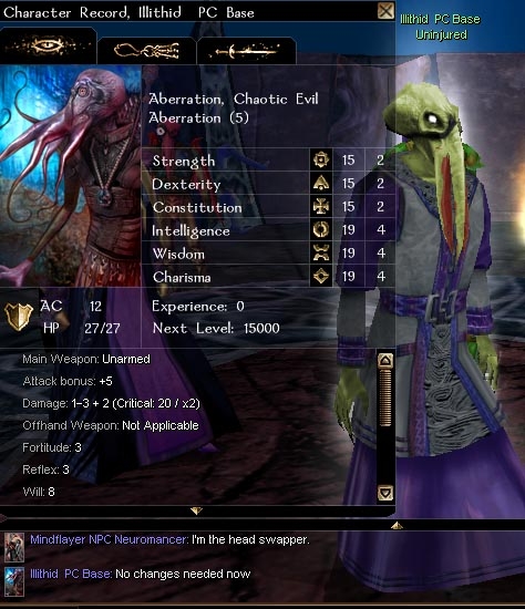A dynamic creature / custom race mindflayer aka illithids, taking advantage of the great new patch 1.67. Play the demo / leveller / headswitcher module using the base mindflayer PC to check out 11 different heads, buy stuff and chat with your octopoid-ish pals.