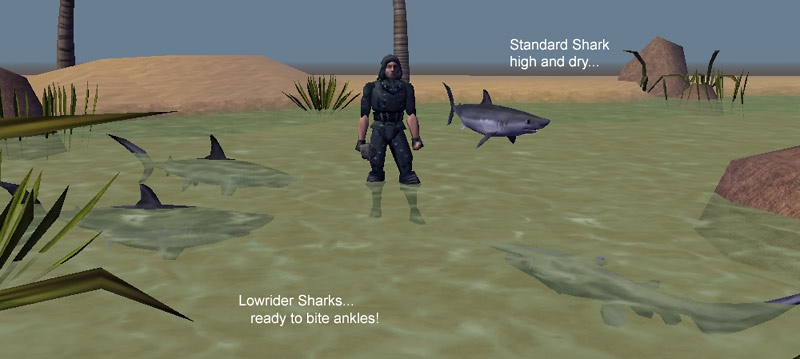 the sharks are neat, but kinda useless unless you have an underwater area. ah, but no more! lowrider sharks fit into standard knee-deep water. they also work great with haks that have water tile placeables or tilesets with walkable deep water (doa city/rural combo has lovely shoreline shallows and deep ocean!). your sharks will no longer fly above nor float on the surface of the waters. how cool is that?
