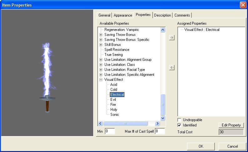 While this isn't precisely what I had in mind when I made the suggestion (I was thinking something that would use custom models that are visible blades that appear to be made of light, as the emitter shields I mentioned), these are nonetheless pretty cool. I especially like the look of the lightning blades. Only reason I'm not leaving a vote is I want to see how they look in-game before I do so. Not sure exactly when that'll happen, since I haven't played NWN in several months now, and may not again, what with NWN2 coming soon.