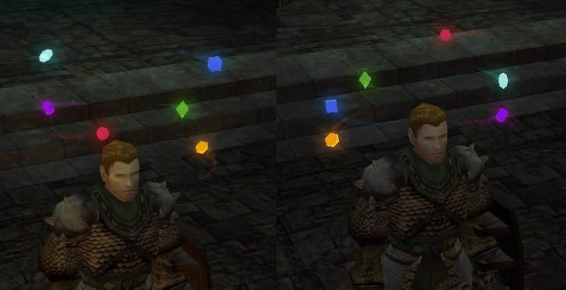 These look soooo much better in-game than they do in the screenshots. Each different shaped stone actually has its own orbit this isn't a perfect halo right around a PC's head. I actually like the fact that they aren't the brightest thing around in a lighter environment.
