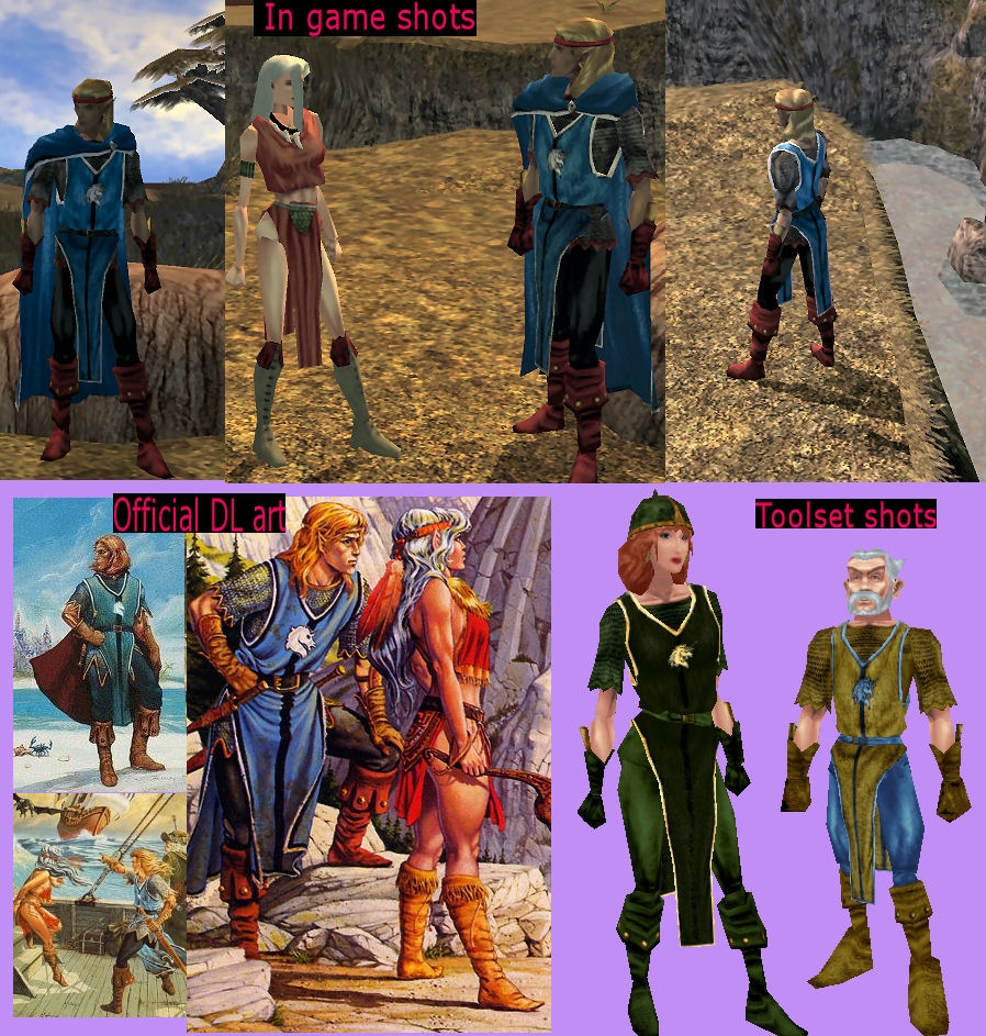 Included in the hak - are clothes for all (normal sized) and an male elf head. I erf'd a pre-set up Gilthanas npc and Gilthanas Armor that you can import and examine. I did not give the character or armor any skills or properties though - that would be up to the users. The cloak btw is in my new cloak hak.