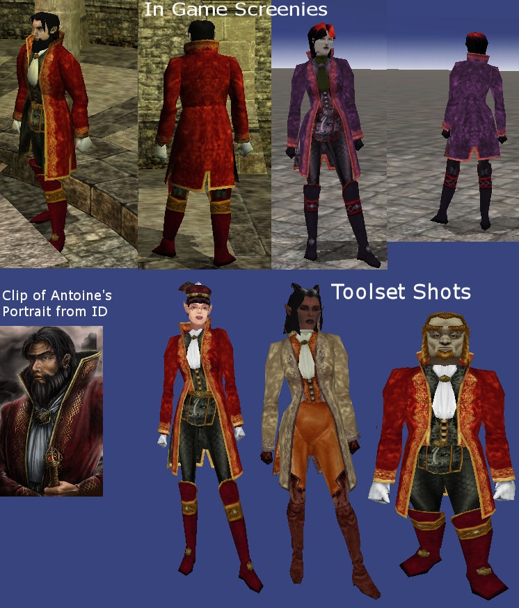 Wearable by all races fem and mal (normal pheno only - head male human only). Why is it fems always look cute in guy clothes but not vice-versa? Parts can be mixed and matched with other clothing parts as usual. For those who want to see the complete set in Antoine's colors - I included an erf for you to import a base NPC - (no skills) and his outfit. Enjoy. :)