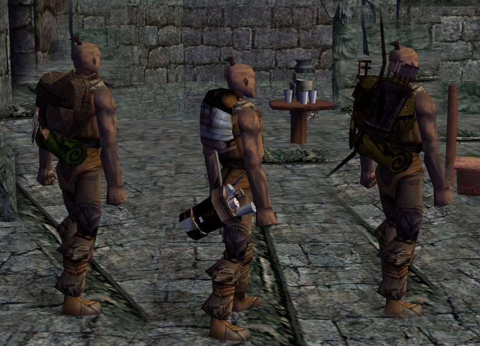 I tried all three packs on several models and most of them looked funny. On human females for example, the back pack shows up with the bedroll sticking to her left arm, the Equipped Backpack is sideways and poking through her body, and the pack for the scroll case shows up right, but the scroll case itself floats several feet in front of her. On the other hand, all three show up fine on the halfling female except the torch on the Equipped Pack is sideways and poking through her arm. There were similar problems with the other races and they were different for both genders.