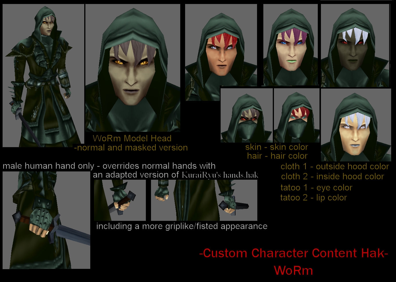 Nice heads and hands WoRm, perfect for my new character, just wondering is there a version of these heads with no hood?