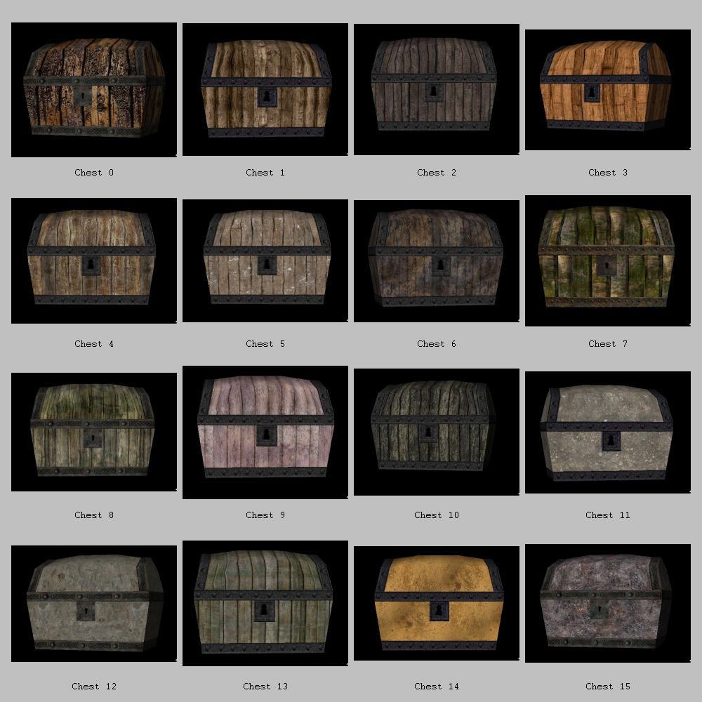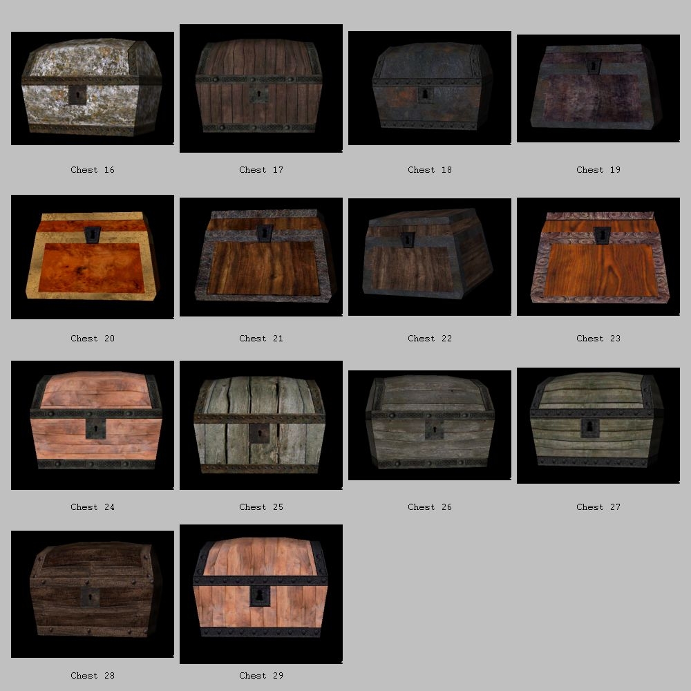 This package adds 90 new chests to the Neverwinter Nights toolset. There are 30 unique chests textures with 3 different