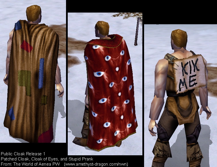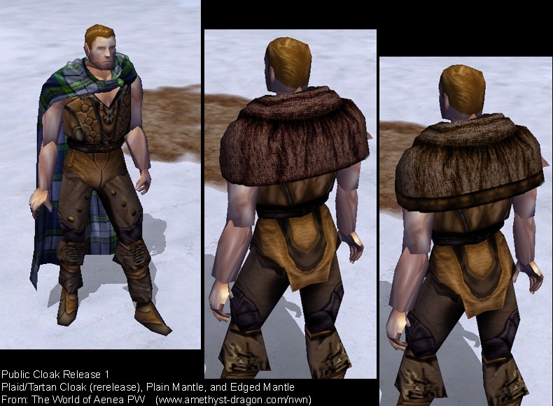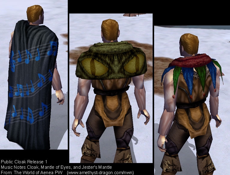 That's what these really are, new plt texture files (and plt icons) that work with some of the basic cloak models. I'm not much of a modeler myself, so I just did the best I could with the skills I've got. :) _________________________ World of Aenea (Hall of Fame PW and the origin of all my works)