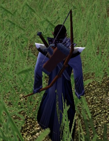 5). Position any bows that are not smaller than the wielder so that it is slung diagonally over the head and 1 shoulder (the string goes across the chest and the shaft across the back) (i.e. Long and Short bows for Dwarves and Halflings, only Long bows for Humans, Elves and Half Orc etc.) Shorter bows would likely be slung over the shoulder only, in a vertical position.