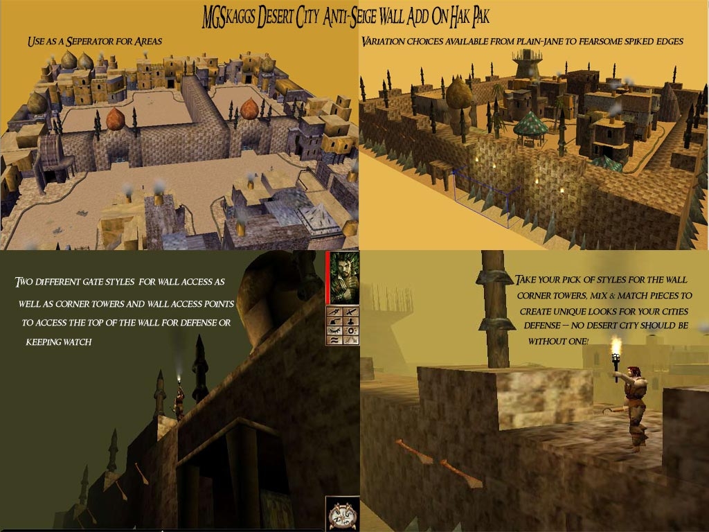 Here is the first add on hak pak for my Desert City tileset. This hak pak also fixes the minimap/walkmeshes bugs that showed up in the Desert City original tileset. Read the Readme file for more information on it.