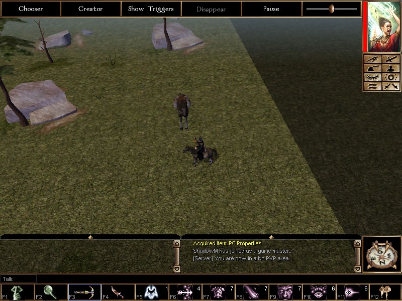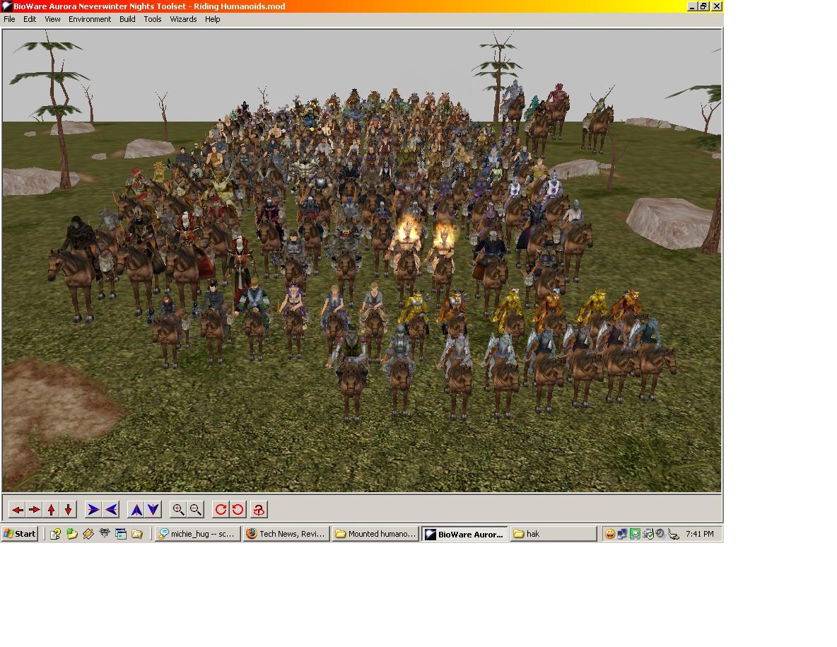 Yes the skeletons fighting each other was intended, so I could check there animations and make sure they working properly. You could prob. script them to mount and demount with scripts like run custom animation(what ever it is for mounting/demounting) then running setappearance back to the standard monster and setting their tail back to null. I have not tried it so not sure if it would work, but then you have to make some script that check a local int on the creature that marked there appearance number and there mounted appearance number. Then drop that into the standard script for the horses and you be good. Yes I come back and give some more details when I have time right now I'm heading off on a rafting trip for a few days :) have fun playing with the new toys everyone hehe