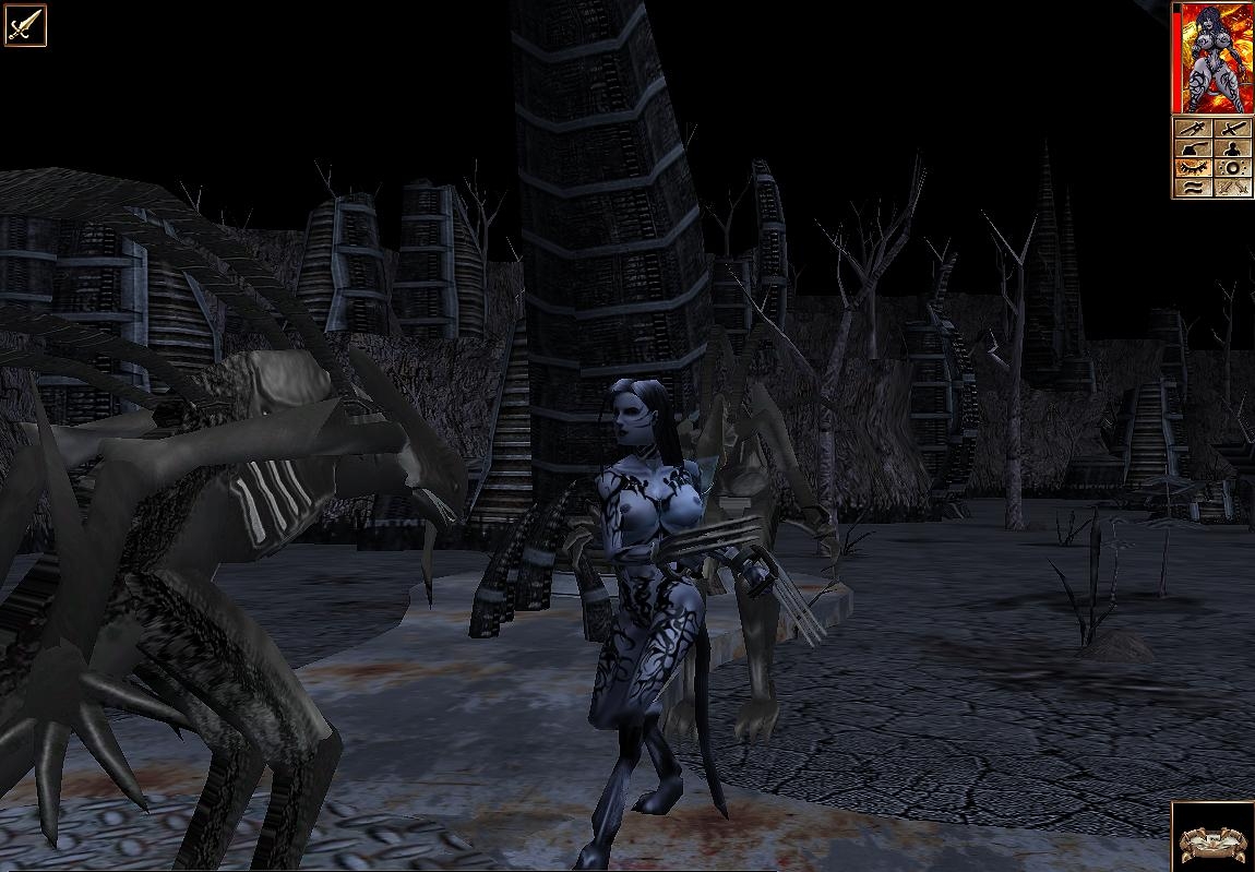 This gives NWN builders a dark, bleak wasteland sort of place with bizarre metal "rocks" and (hopefully) interesting looking alien structures. You also get tin-plated outpost buildings which should look in keeping with the PHoD Metal City. (This is called 'continuity' by we mad scientists.) You also also get some other strange stuff and also also also get weird bio-mechanoid trees, the textures of which (as far as I know) mark the first appearance of H.R. Giger's art into NWN.