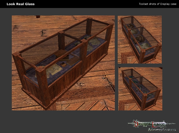 The hak contains three placeable display cases. What makes them unusual is that they are glass display cases. Suitable for fine retailers and wealthy merchants everywhere, these display cases are state of the art and are said to even repel the curious fingers of Kender (well as long as you are watching them carefully). Also included is a custom glass environment map for use in other glass creations. A tutorial exists elsewhere on the Vault showing how the glass modifier is applied to an object in NWN.