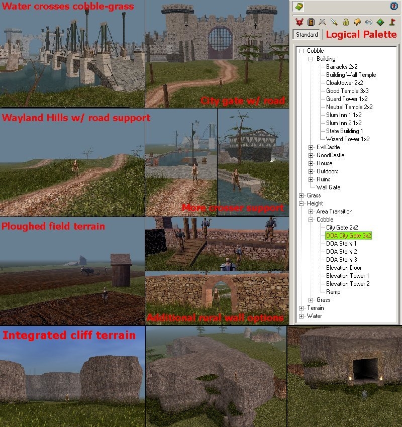 Just what the community needs... yet another city-rural combo set. The City/Rural Builder Base was designed to create a city surrounded by rural areas and features, namely housing and small farming communities. It was not designed for a 'grass city or rural town', so all city features and terrains are not reskinned in this set. It includes references to the default Bioware city and rural tilesets, selected city and forest tiles reskinned to grass, modified rural terrains (lowered cliffs, raised water) to integrate the set, and essential third-party custom content, such as alleys, hills, beaches, and waterfalls.