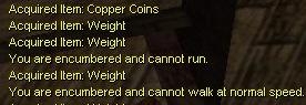 5.) For encumbrance and weight purposes, all coins are considered to weight exactly 0.02 pounds (50 = 1 pound; this is adjustable in coins_inc). When coin is acquired, weight objects are destroyed from the PC, coins_onacqu counts the number of coins carried and divides it by 50, and then weight objects are created on the PC (stackable to 50,000, each weighs one pound). These objects are then marked as cursed so that they cannot be dropped. Should a PC drop their weight stones the OnUnAcquire script will instantly recognize the imbalance between weight and coin items and give them more. In other words, I am uncertain if it is even possible for players to cheat the weight system. These weight items are not created on DMs and NPCs. Builders should feel free to remove the GetIsPC check to coins_acqu and coins_unacqu if they want DM/NPC encumbrance due to coins.