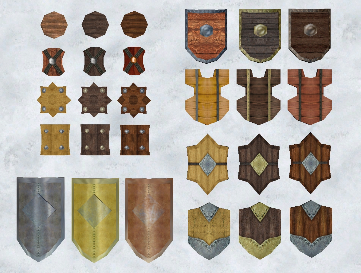 Reskins for all small shields and all large shields from Neverwinter's original release are included in this set, plus the 1st set of 3 tower shields.