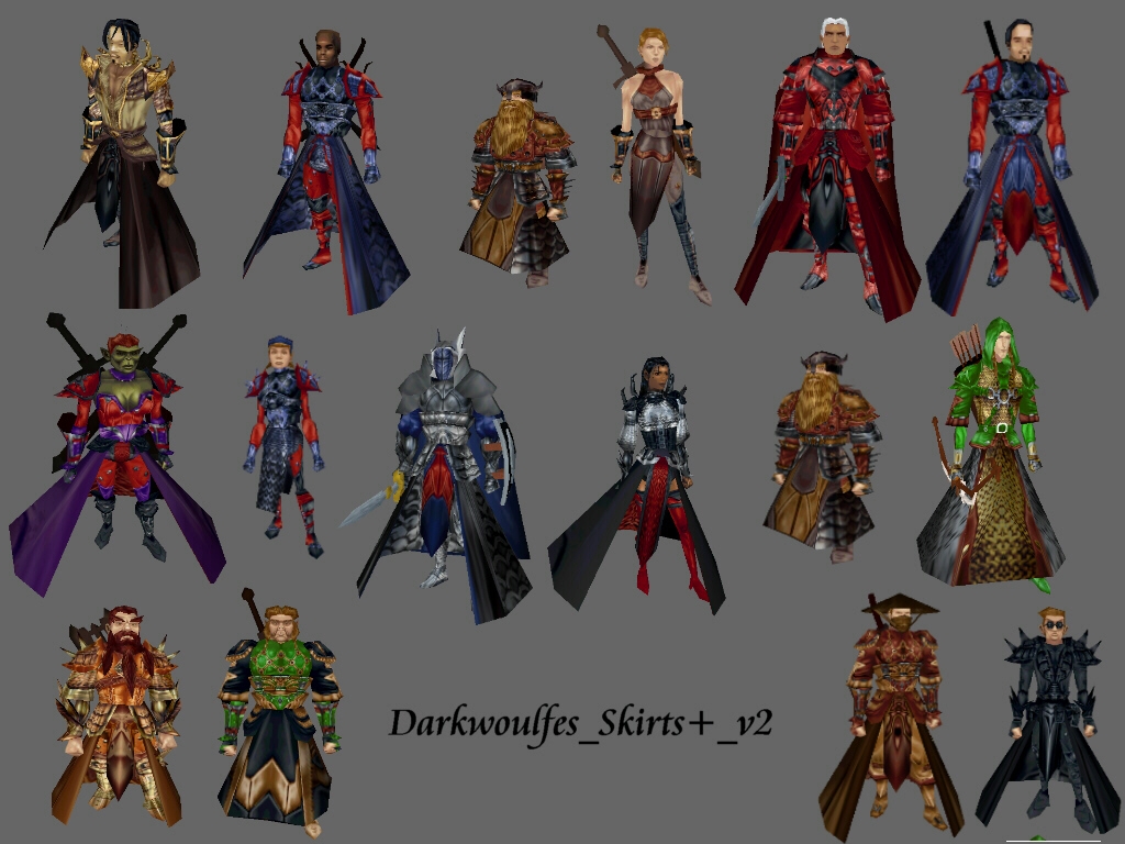 Sorry everyone we had a storm go through St. Louis and it destroyed my main pc. The hard drives seem ok but the system is booting intermittently. So now I'll be on forced vacation I hope the neck textures aren't putting everyone off. The one for the large cloak is included in the first skirts+ hak so if you add that first then this hak your cloaks should be ok. I apologize to the novices, It probably seems like I'm rambling. But even without the cloak there are a lot of cool things in these hakpaks.