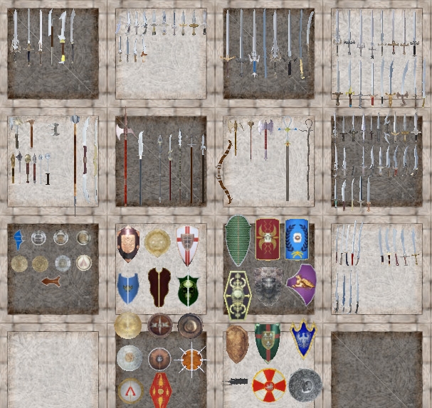 The hak is made up of: -- 9 Small Shields -- 14 Large Shields -- 12 Tower Shields -- 6 Bastard Swords -- 14 Daggers -- 8 Great Swords -- 17 Long Swords -- 25 Short Swords -- 5 Katanas -- 5 Scimitars -- 4 Rapiers -- 2 War Hammers -- 6 Maces -- 1 Kama -- 1 Double Mace -- 2 Double Swords -- 2 Halberds -- 5 Short Spears -- 1 Longbow -- 3 Battle Axes -- 2 Mage�s Staves--
